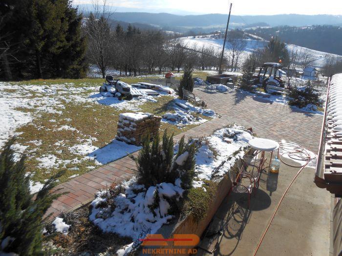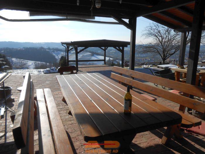 Ispred podruma je popločena i natkrivena terasa sa šankom i roštiljem, ispred ulaza u vis. prizemlje je također prekrasna terasa.